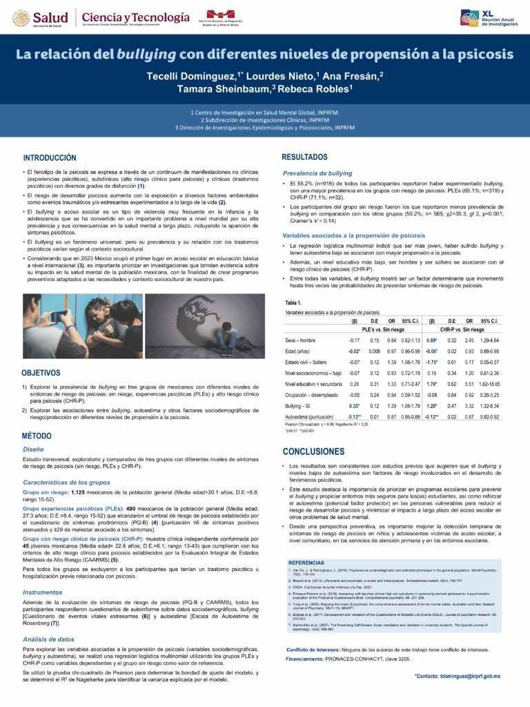 - Domínguez, T., Nieto , L., Fresán, A., Sheinbaum, T., Robles. R.. (2025). The association of bullying and self-esteem with psychotic-like experiences and clinical high risk for psychosis symptoms. Child and Adolescent Psychiatry and Mental Health 19, 51. https://doi.org/10.1186/s13034-025-00900-w